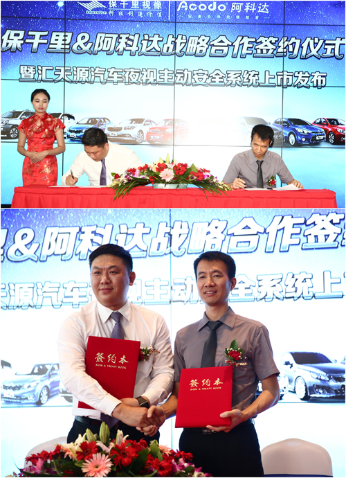 保千里&阿科達戰略合作簽約儀式暨匯天源汽車夜視主動安全系統上市發布會于8月19日在深圳市東風悅達起亞香蜜湖4S店舉行。