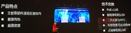 同時在曙光技術大會上展示了另一款高能效的技術,全液冷產品。該產品現在還處于研發階段,主板等部件全部浸泡在無腐蝕不燃導熱性佳的液體里,展區工作人員表示該液體主要成分是油,可大幅降低能耗,相比傳統數據中心能耗降低90%以上,PUE可達1.05以下。